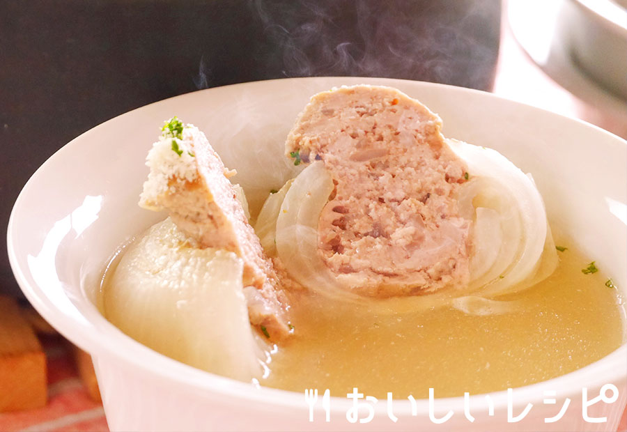 - 新たまねぎの丸ごとスープ煮たまねぎをくり抜いて挽き肉を詰めた、シンプルな丸ごと煮。スープまで飲み干したくなるおいしさです。