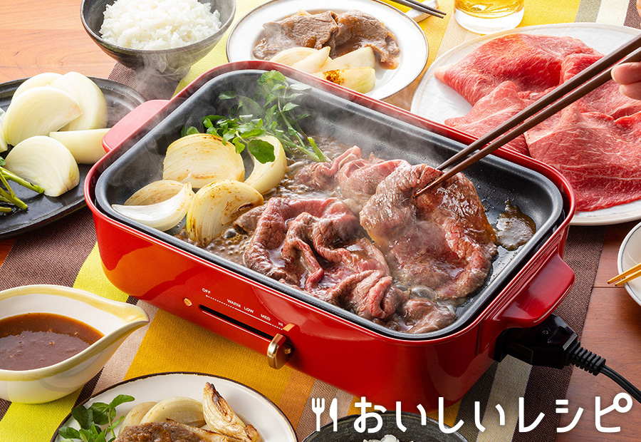 - ホットプレートで黄金焼しゃぶすき焼き・しゃぶしゃぶ用の薄切り肉をホットプレートで贅沢に楽しもう! ジュージュー熱々を召しあがれ!
