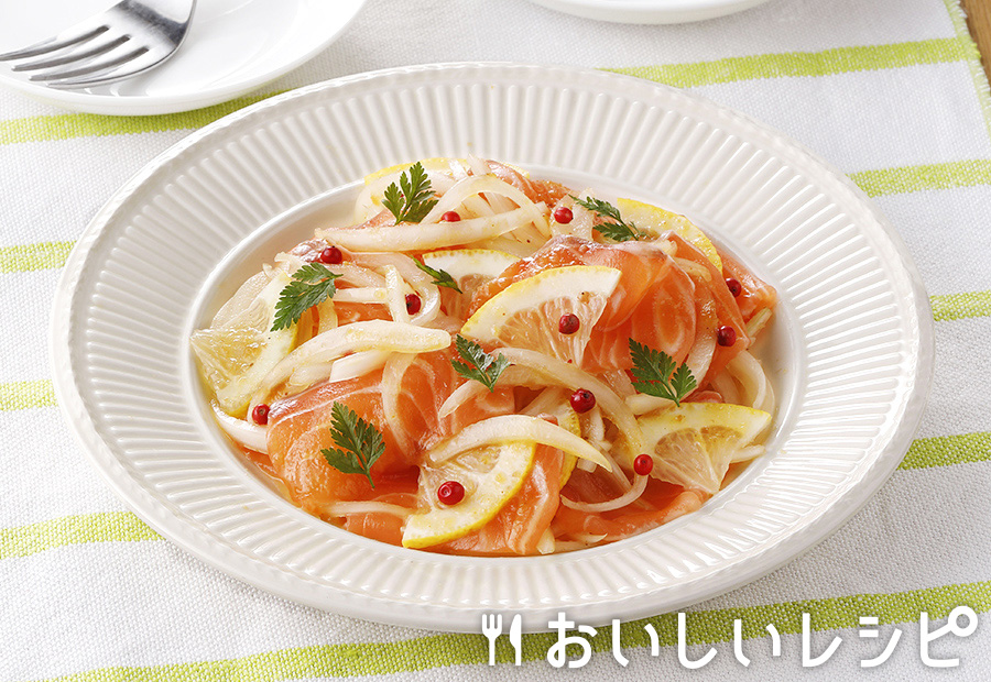 - たれポン酢でサーモンマリネサッと和えるだけで、簡単マリネの出来あがり! さっぱり軽やかな味わいがマリネにもピッタリ!