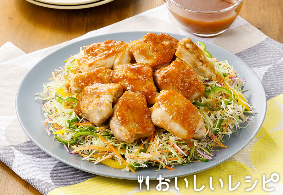 - たれポン焼肉サラダ(鶏肉)カット野菜に焼いたお肉をのせるだけ! 「黄金の味 焼肉たれポン酢」で、肉も野菜もおいしい一皿!