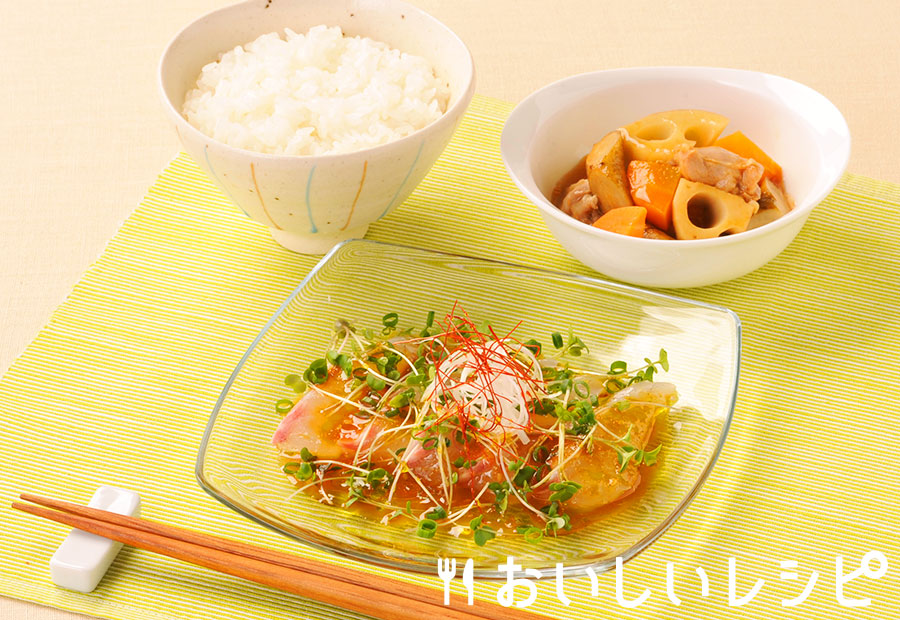 - 鯛の黄金カルパッチョ病院の管理栄養士の先生が考案した、「黄金の味」を使った簡単・おいしい低塩メニュー