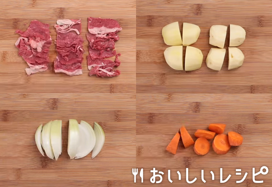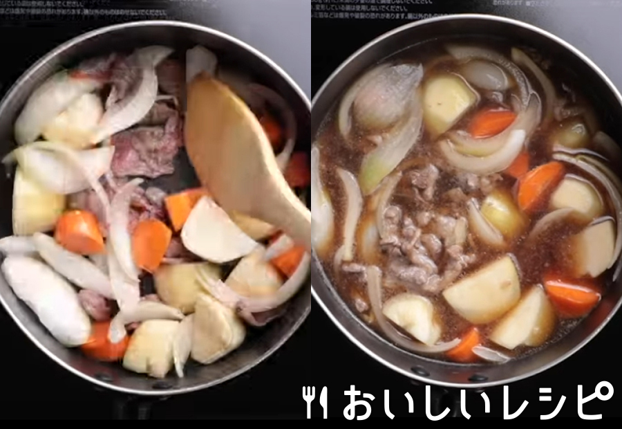 牛肉は一口大に、じゃがいもは4つ切りにして水にさらし、たまねぎはくし形切りに、にんじんは乱切りにします。 鍋に油を熱し、(1)を炒めて水を入れ、ひと煮立ちしたら「すき焼のたれ」を加え、じゃがいもがやわらかくなるまで煮て、出来あがりです。 ※お好みでゆでた絹さやを添えてお召しあがりください。