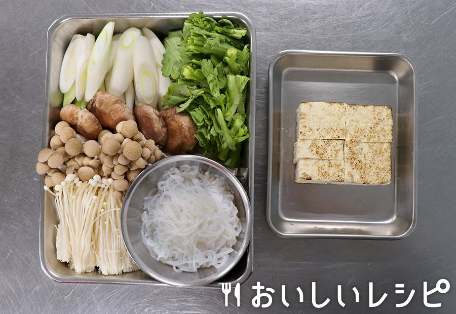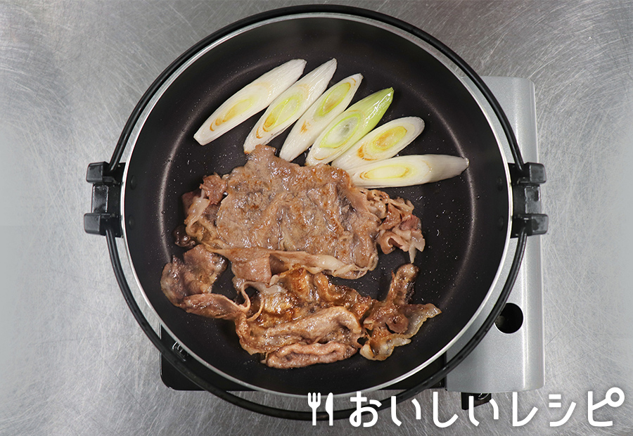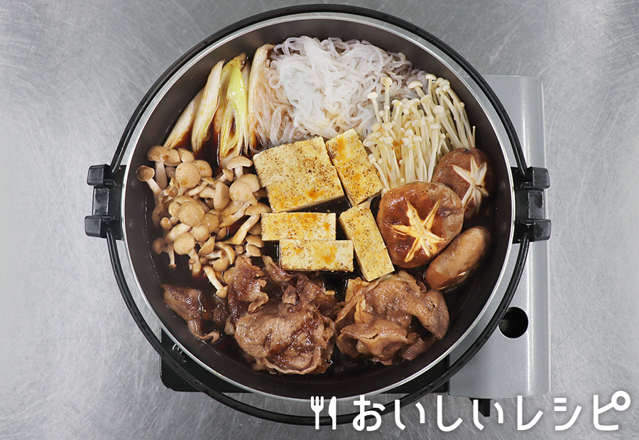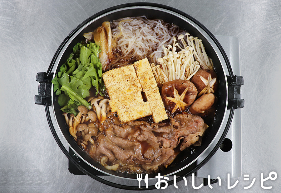 長ねぎは斜め切りに、春菊は4~5cmの長さに、きのこ類は石づきを切り小房に分け、豆腐は水きりして食べやすい大きさに、しらたきは下ゆでして食べやすい長さに切ります。 熱した鍋に牛脂をひき、牛肉・長ねぎの順に焼きます。 「すき焼のたれ」を注ぎ入れ、春菊以外の残りの具材を加えて煮込みます。 仕上げに春菊を加えて、出来あがりです。