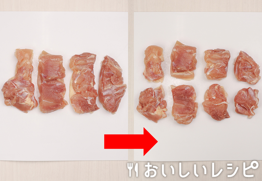 鶏もも肉は皮を下にしてまな板に置き、一口大に切ります。