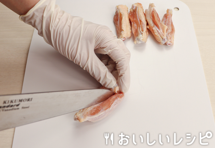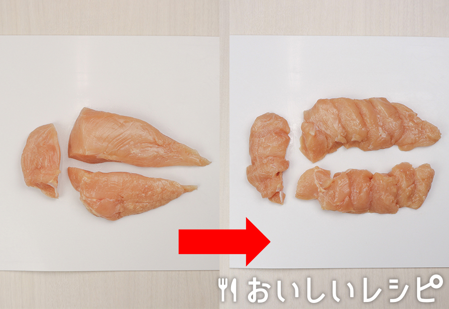 鶏むね肉は皮を取り除き、繊維の方向ごとに3つに切り分けてから、繊維を断つように薄くそぎ切りにします。