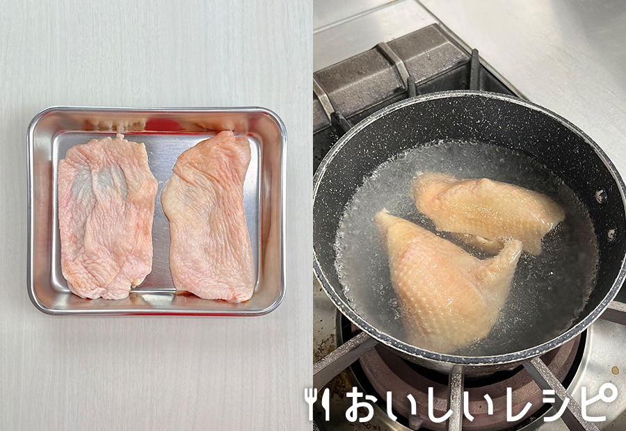 鍋に湯を沸かし、酒少々(分量外)を入れて鶏皮をゆで、ザルにあげて流水で洗います。