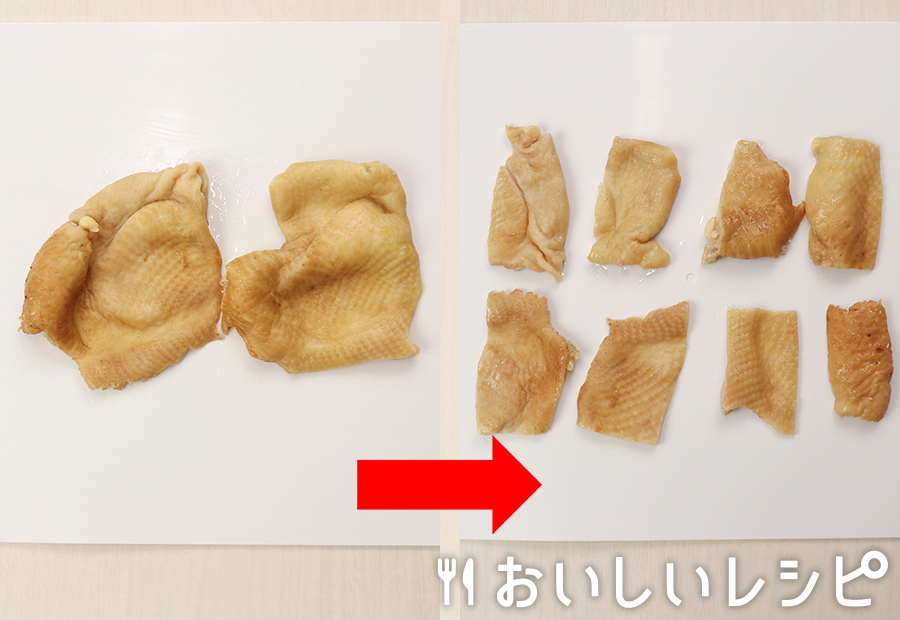 キッチンペーパーで水気を拭き取り、食べやすい大きさに切ります。
