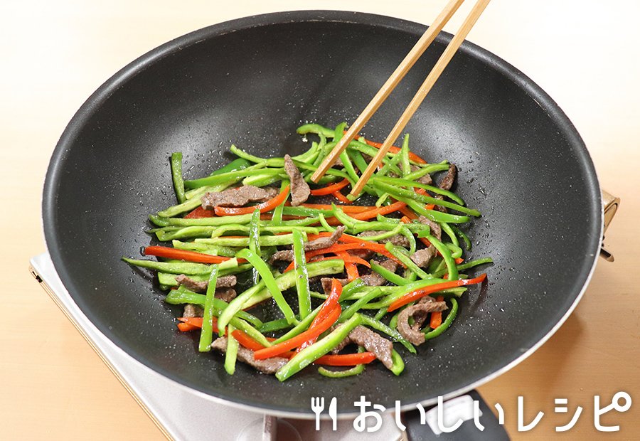 フライパンに油を熱し、強火で肉を炒め、ピーマンを加えて炒め合わせます。